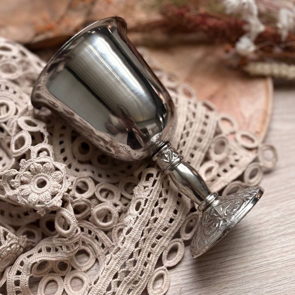Ce calice en métal argenté, finement ouvragé, est un incontournable des pratiques rituelles.