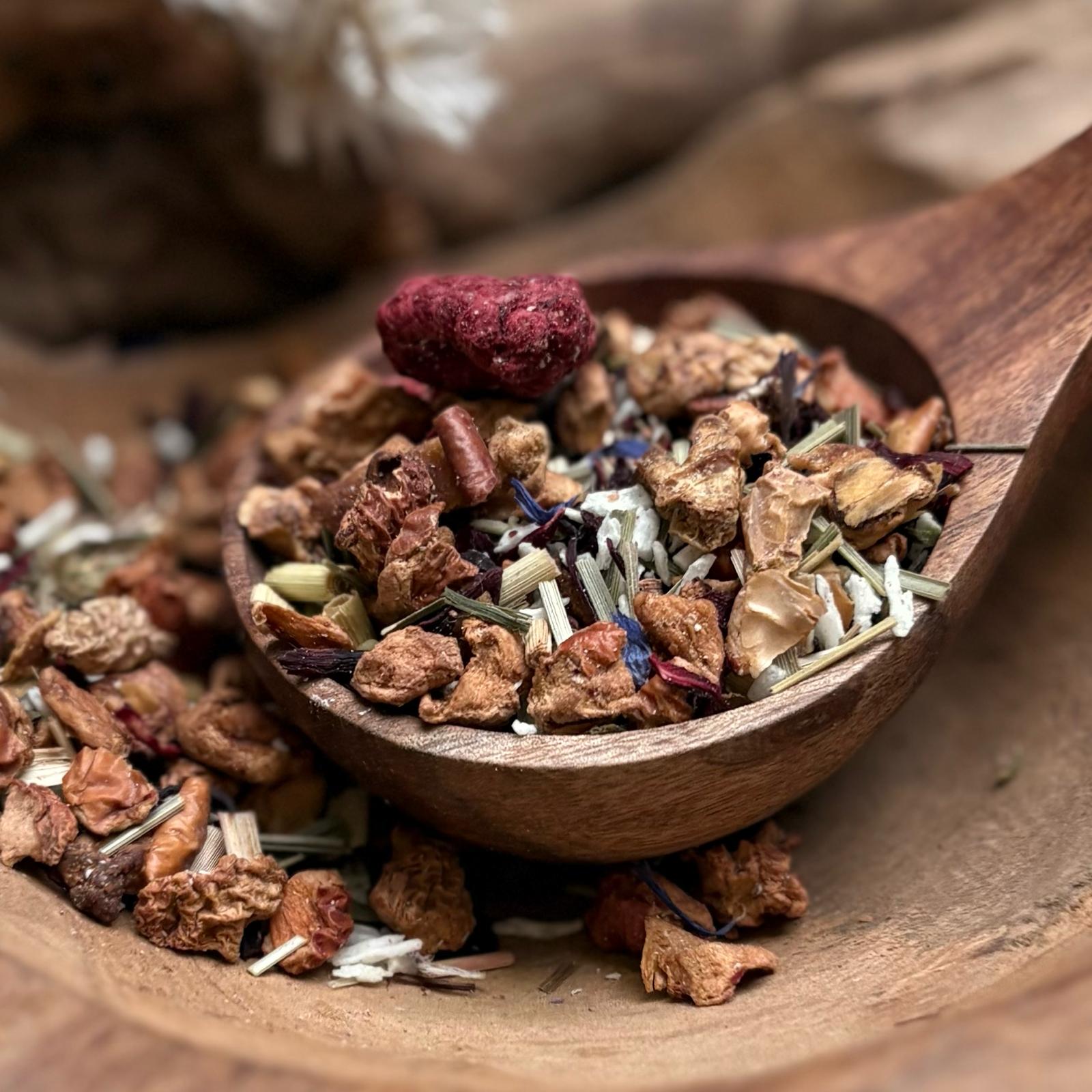 Un mélange lumineux, légèrement acidulé, qui donne l’impression d’ouvrir les fenêtres d’une pièce restée fermée trop longtemps. La framboise adoucit, le citron vert réveille, l’hibiscus apporte son rouge vivant… et tout s’équilibre dans une tasse qui remet du mouvement, du souffle, de l’envie.