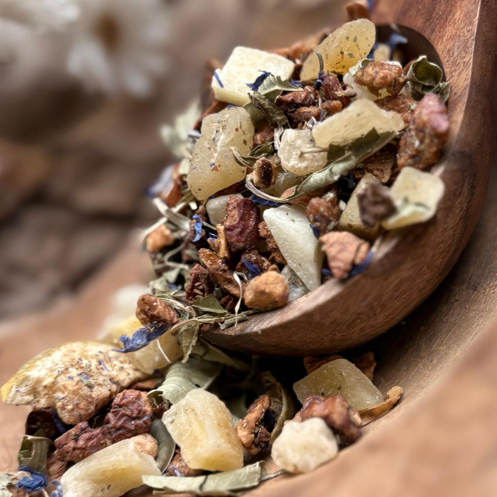 Mangue (mangue, sucre), Pomme, Melon (melon, sucre), Ananas (ananas, sucre), Arôme, Verveine entière, Coing, Fleurs de bleuet, Figue, Tranches de kiwi, Cerise.