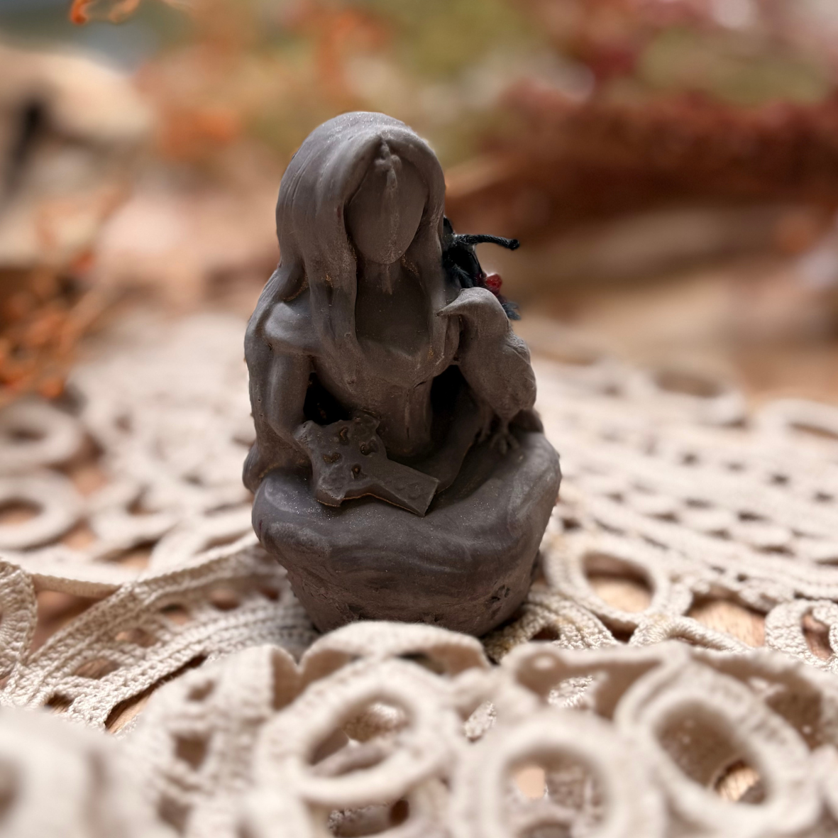 Cette statuette rend hommage à son énergie brute : une femme assise, silencieuse, coiffée par le vent, accompagnée de son corbeau-guide. Idéale pour les personnes qui veulent reprendre leur pouvoir, couper ce qui n’a plus lieu d’être ou protéger leur espace sacré.