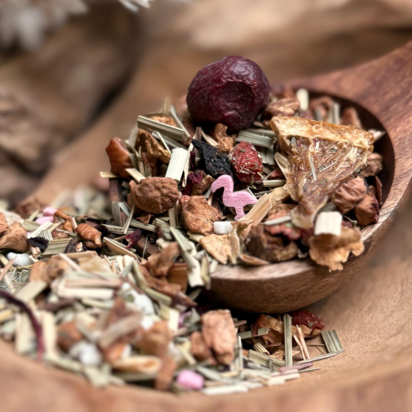 Pomme, Citronnelle, Ananas (ananas, sucre), Flamants roses en sucre (sucre, farine de riz, huiles et graisses végétales (colza), fécule de pomme de terre, concentré de jus de betterave, arôme), Baie de goji, Morceaux d’orange, Hibiscus, Arôme, Betterave rouge, Canneberge, Fraise, Menthe à la pomme.