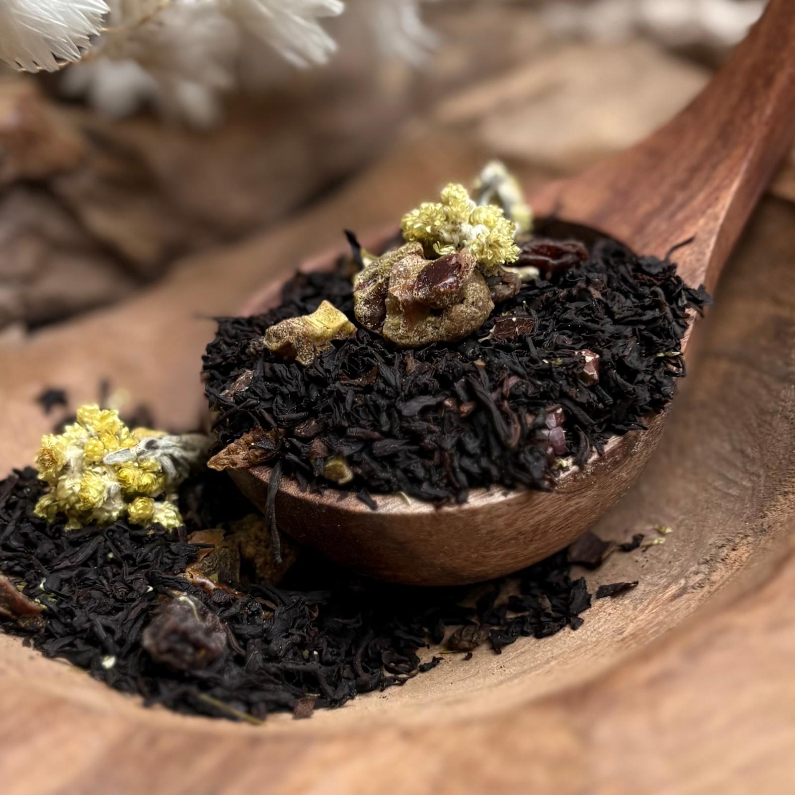 Thé noir Assam*, Inde du Sud*, Datte (datte, farine de riz)* (24%), Raisin (raisin, huile végétale), Arôme naturel (citron), Écorces de citron (3%), Fève de cacao concassée*, Bâtons de cannelle*, Figue (figue, farine de riz)* (3%), Fleurs d’immortelle*, Échinacée pourpre*.